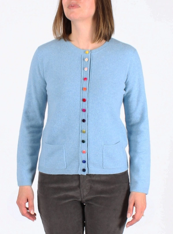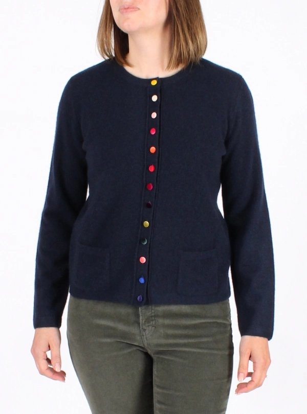 This women's cardigan features a classic round neck and multicolored buttons along its length, adding a whimsical touch to this timeless piece. The two front pockets provide practical functionality while maintaining the garment's elegance.