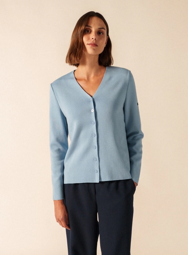 The Brévands cardigan is a refined staple crafted from 100% pure wool in a soft and structured 1x1 rib knit. Featuring a V-neckline and subtle tone-on-tone buttons (15 mm), it offers both natural warmth and understated sophistication for every season.