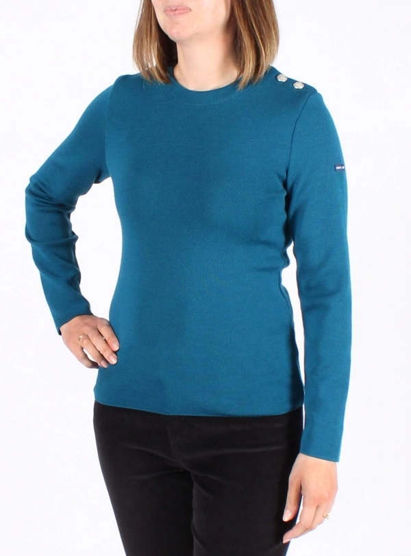 Crafted from 100% virgin wool, this sweater provides exceptional warmth and softness. The fitted cut enhances the feminine silhouette while maintaining the practicality of a traditional marine sweater. The distinctive shoulder buttoning adds a touch of authenticity and style.
