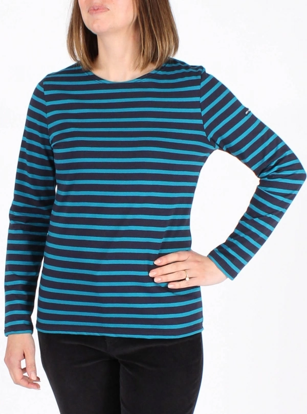 A feminine reinterpretation of the iconic Minquiers shirt, the Minquidame stands out with its signature stripes, classic round neckline, and long sleeves. The fitted silhouette flatters the figure while remaining easy to wear—perfect for both relaxed and polished looks.