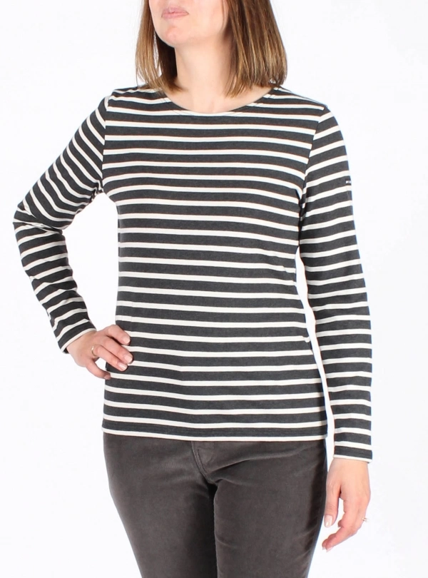 Version féminine de l’emblématique modèle Minquiers, la Minquidame se distingue par ses rayures indémodables, son col rond classique et ses manches longues. Sa coupe ajustée épouse les formes tout en restant confortable, pour un style à la fois chic et décontracté.
